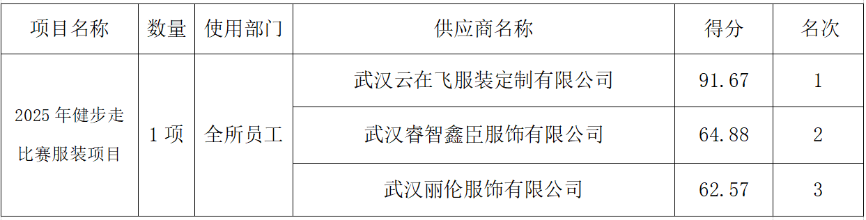 ? 武漢檢驗檢測認證發(fā)展集團有限公司工會小組于2025年1月24日上午,組織了“健步走比賽服裝采購項目”采購競爭性談判,結果公示如下:
